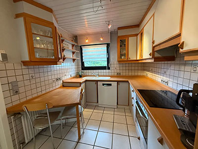 Im Erdgeschoß des Hauses befindet sich ein 36 qm großes Wohn/Esszimmer mit Zugang zur teils überdachten Terrasse und zum Garten. Die 17 qm große Wohnküche mit direktem Zugang zu einer Speisekammer verfügt über eine neue Einbauküche mit Elektrogeräten , bietet Platz für einen Esszimmertisch und hat einen Balkon. Des weiteren befinden sich ein Abstellraum und ein Gäste-WC in dieser Etage. Im Obergeschoß, das eine normale Deckenhöhe ohne Dachschrägen hat, liegen drei Schlafzimmer, eins davon mit begehbarem Schrank, ein Badezimmer mit Dusche und ein weiterer Abstellraum. Auch hier gibt es einen Balkon mit Blick über den Garten.Der Keller sowie die sich darin befindende Heizungsanlage (Gas) müsste renoviert werden. Das Dach, die Aussenfassade sowie einige Fenster wurden 2017 komplett erneuert. Die restlichen Fenster sind jedoch auch doppeltverglast.